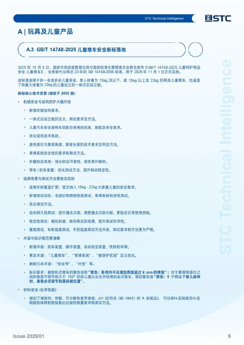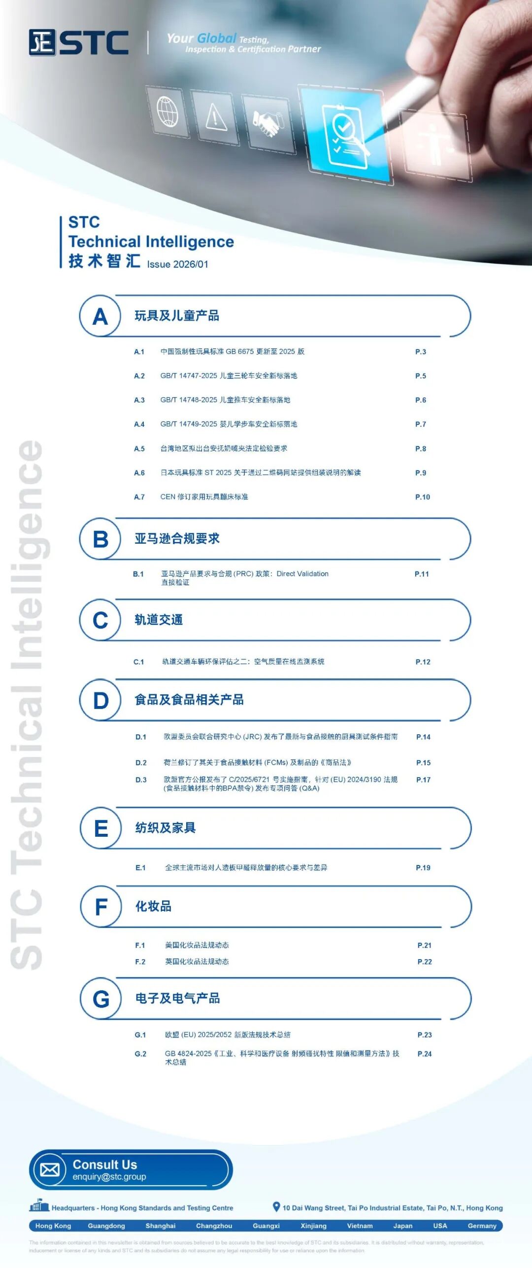 STC 技术团队整合各行业的测试、检验及认证(TIC)相关重点资讯,推出全新的行业资讯期刊《STC Technical Intelligence 技术智汇》,让您快速掌握市场最新动态,包括:全球市场准入要求及最新资讯、产品法规及标准更新、行业热门话题及趋势等。