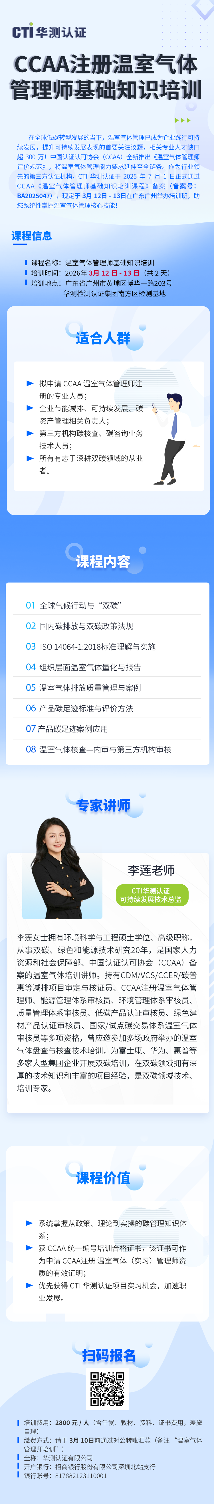 同时,CTI华测认证 2025 年 7 月 1 日正式通过 CCAA《温室气体管理师基础知识培训课程》备案(备案号:BA2025047),获CCAA授权开展注册温室气体管理师培训。已成功于昆明、成都、深圳、郑州、上海、北京、长沙开办多场专业培训,均获参训学员认可。现定于2026年3月12日-13日举办广州市首场培训班,助您系统性掌握温室气体管理核心技能!